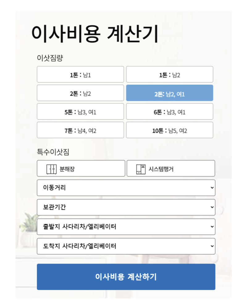 이사 스토리는 연락처만 입력하면 전문가가 무료로 견적을 비교해 주는데요 ~1분 이사비용계산기로 이사물량을 산출하고 여러 업체의 이사비용을 한 번에 비교할 수 있습니다. 먼저 이사비용 계산기로 대략적인 이사비용을 계산할 수 있으며, 정확한 견적은 자신의 이사 종류를 클릭 후 이사 예정일과 이사 주소 등을 기입하면 최대 3개 업체의 견적을 받아 볼 수 있습니다. 이사스토리는 인증심사, 후기, 페널티 제도, 예치금 관리 등 꼼꼼한 운영으로 우수업체를 추천합니다.